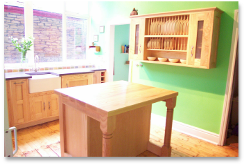 The island cabinet, with its solid Ash worktop, has a workable area on one side and a seating area on the other.